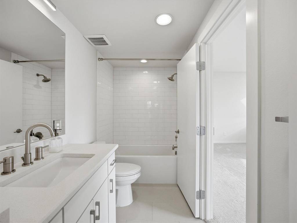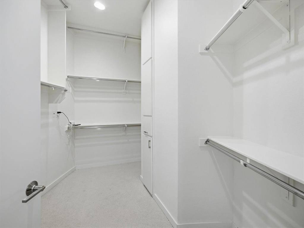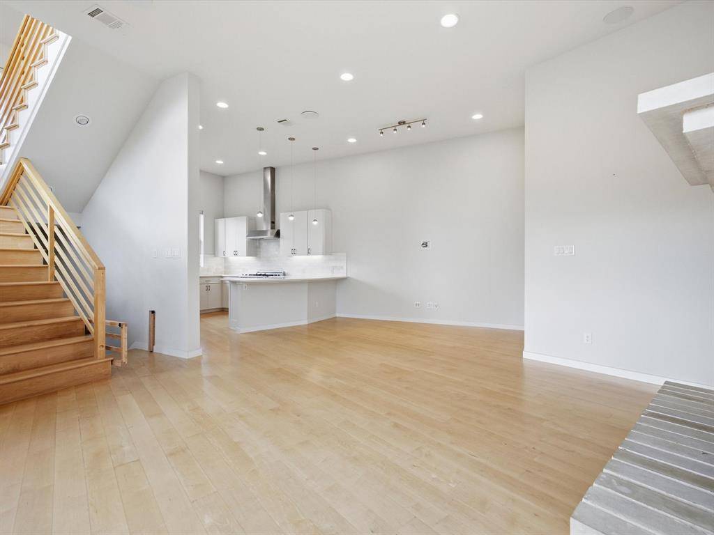 Upstairs, the heart of the home features an open-concept layout filled with natural light. The gourmet kitchen boasts expansive quartz countertops, a 6-burner gas range with stainless steel vent hood, custom cabinetry, and generous storage. It opens to a spacious dining area and living room anchored by a stone fireplace and oversized windows that frame treetop views. The main owner's suite is also on this floor, offering polished concrete floors, a spa-like bath with dual vanities, a walk-in shower, and a custom closet system. On the third level, enjoy a second living area perfect for media, fitness, or a home office, along with a third private bedroom and bath. Step outside onto the covered balcony—ideal for relaxing or entertaining with city views and seasonal color. Additional highlights include light-toned hardwoods, recessed lighting, sleek finishes, and a neutral palette ready for your personal touch. A rare find in one of Dallas' most sought-after neighborhoods!