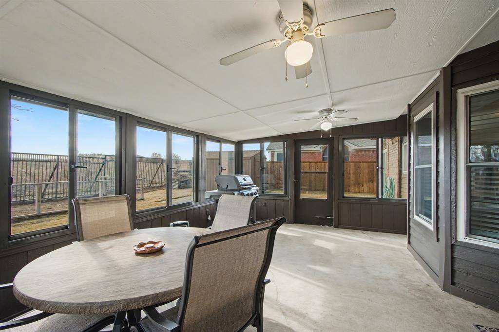 The enclosed patio with windows creates a flexible year-round living space suited for relaxing, entertaining, or working from home. The private backyard includes updated fencing completed in 2022 and 2024 along with a storage shed for additional storage. Exterior paint on the rear of the home and shed has also been refreshed.