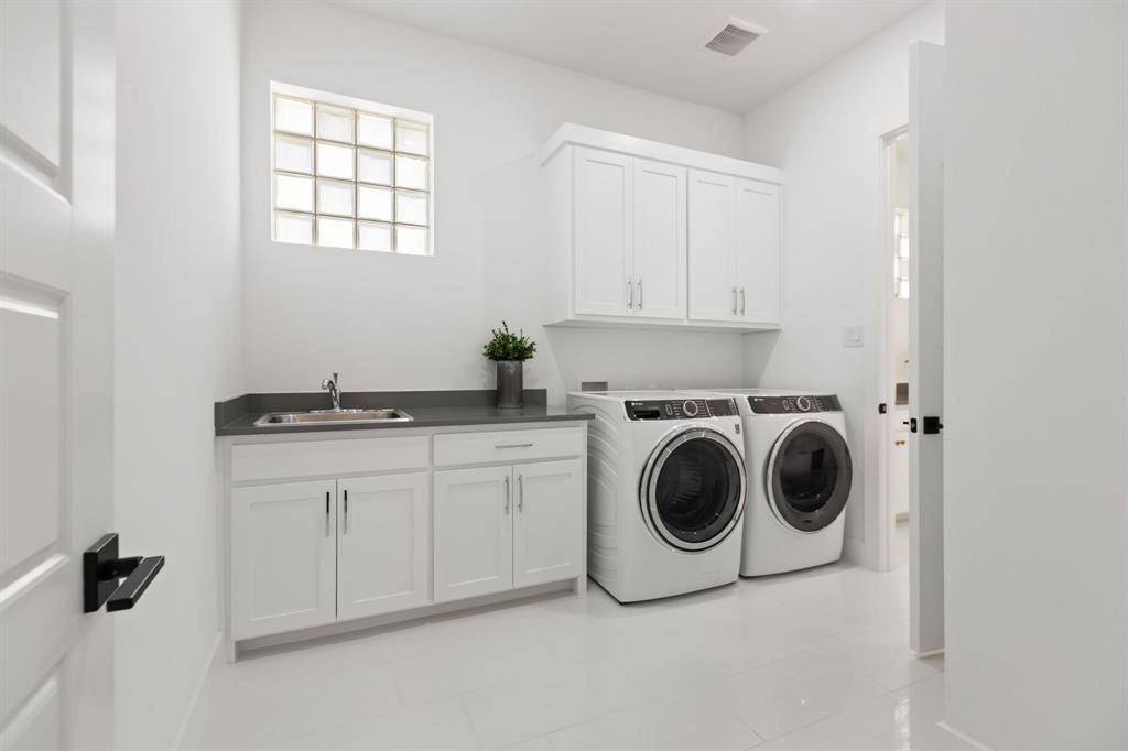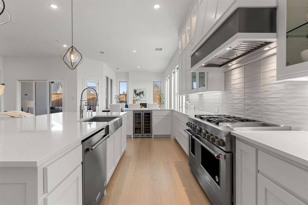 The light-filled kitchen & living areas showcase elevated finishes throughout. An oversized island anchors the space, complemented by a 48-inch built-in refrigerator, wine & beverage refrigerator, premium KitchenAid appliances, ceiling-height cabinetry, additional windows added to capture the greenbelt and water views & designer lighting that enhances the home's clean, modern aesthetic.