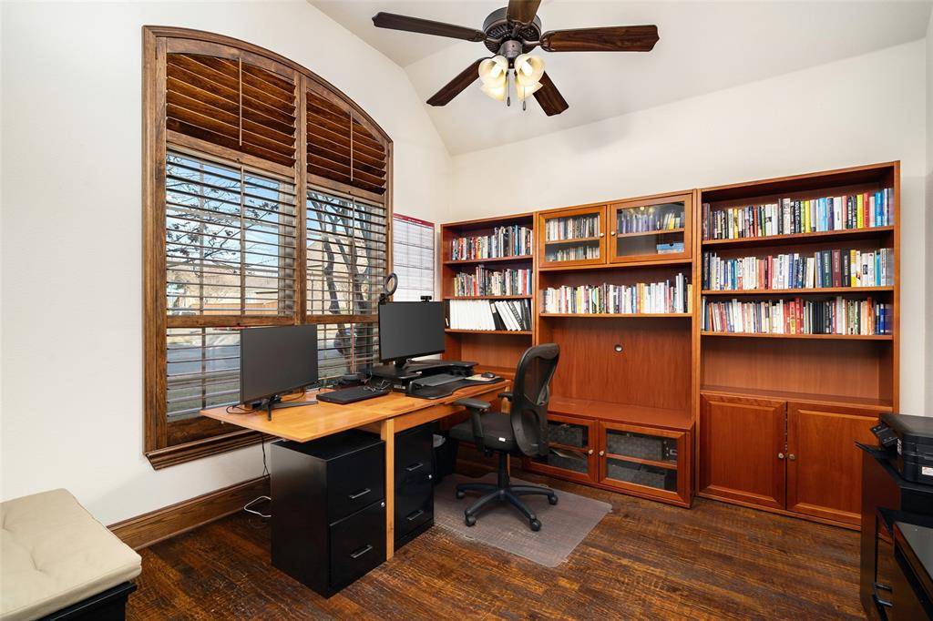 North-facing Highland home located in the master planned community of Starcreek has been meticulously maintained and is ready for move-in. The primary bedroom, another bedroom plus the study are located downstairs. Three bedrooms, gameroom and media room are upstairs. Handscraped hardwood floors on most of the bottom level. Carpet replaced in two downstairs bedrooms in 2025.Plantation shutters, eight foot solid wood doors downstairs, crown molding and more. Wired for speakers in many rooms as well as outdoor living area. The study is located off the entry with french doors. Spacious family room with stone fireplace is open to the gourmet kitchen. The kitchen features an island, an abundance of custom cabinets, appliances including a 5-burner gas cooktop and double ovens. Dishwasher was recently replaced. The breakfast room has two walls of windows, making it light and bright. The large primary bedroom is split from the other bedrooms and features a vaulted ceiling and sitting area. The bath includes a garden tub, a separate shower, and large walk-in closet. Guest bedroom down includes its own full bathroom. The gameroom and media room are spacious. Media room includes built-in surround sound speakers, columns with sconces. Backyard has lovely landscaping, and is surrounded by a 6 foot board on board fence. Three car garage. Recent updates include 2 water heaters (2023), roof and gutters (2023), interior paint (2025).