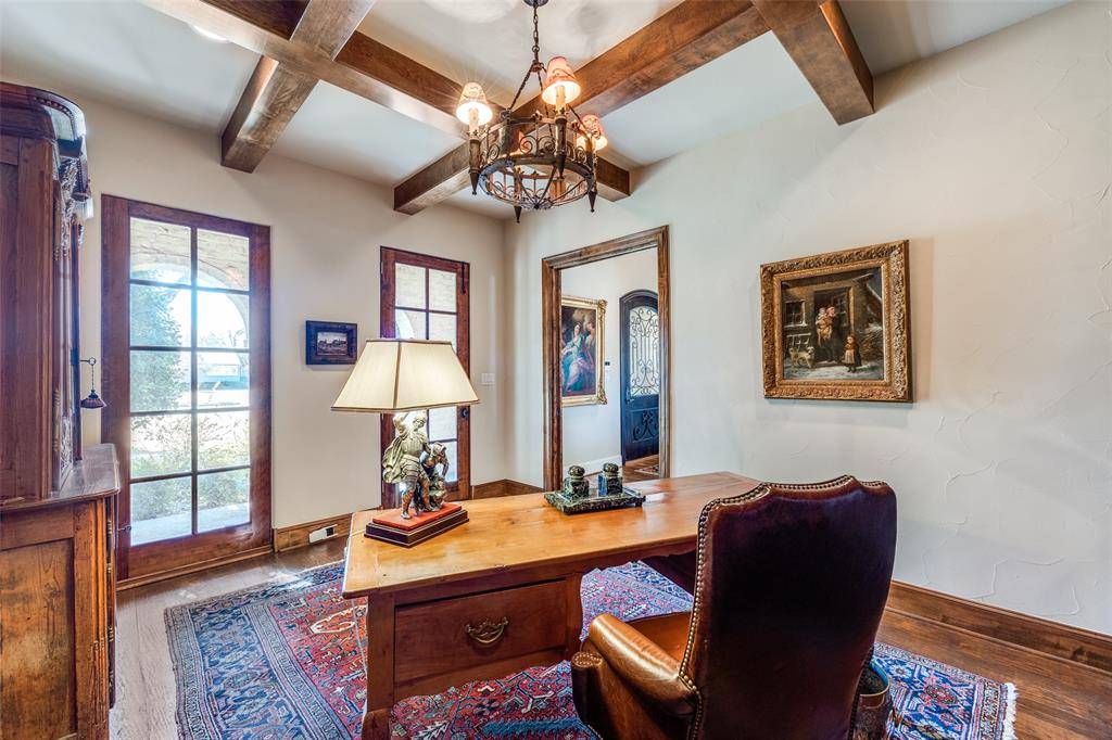 The living room has a beamed decorated ceiling that flows seamlessly into an elegant, large open kitchen. A formal dining room comfortably seating ten, an office, and a powder room are also located on the main floor.