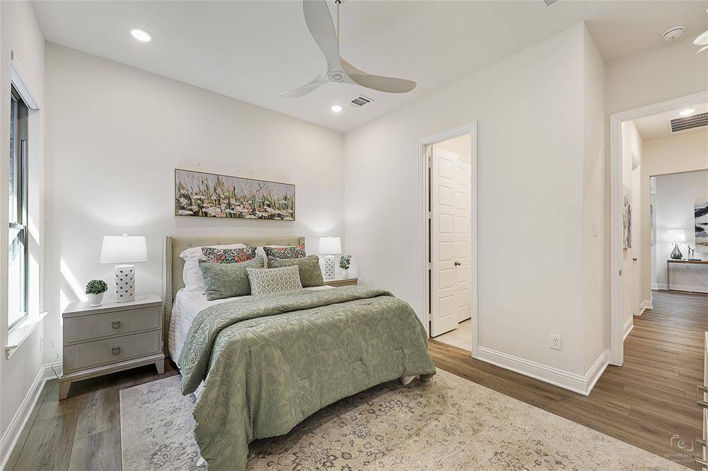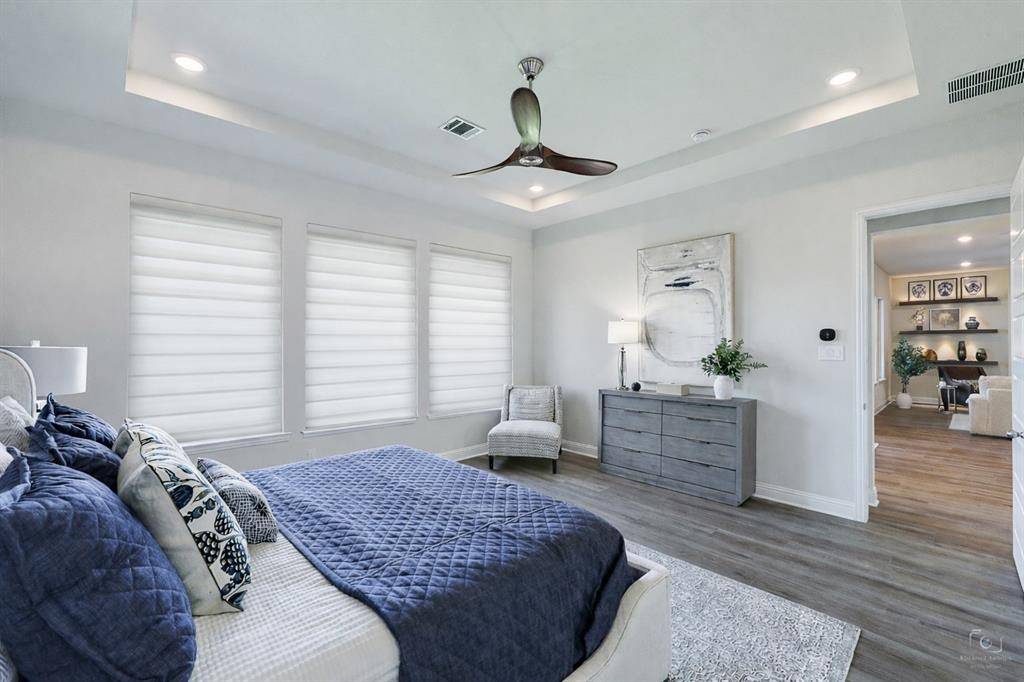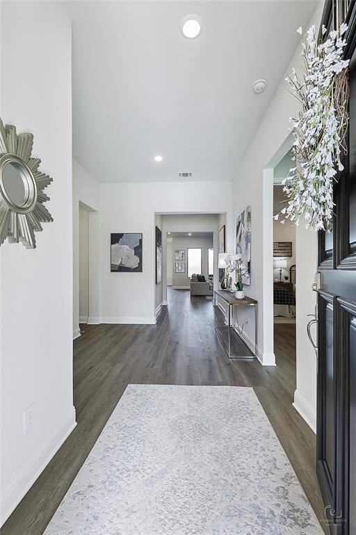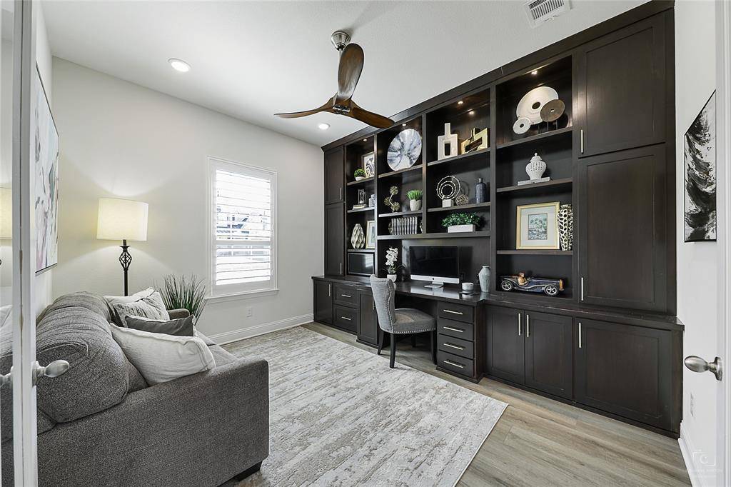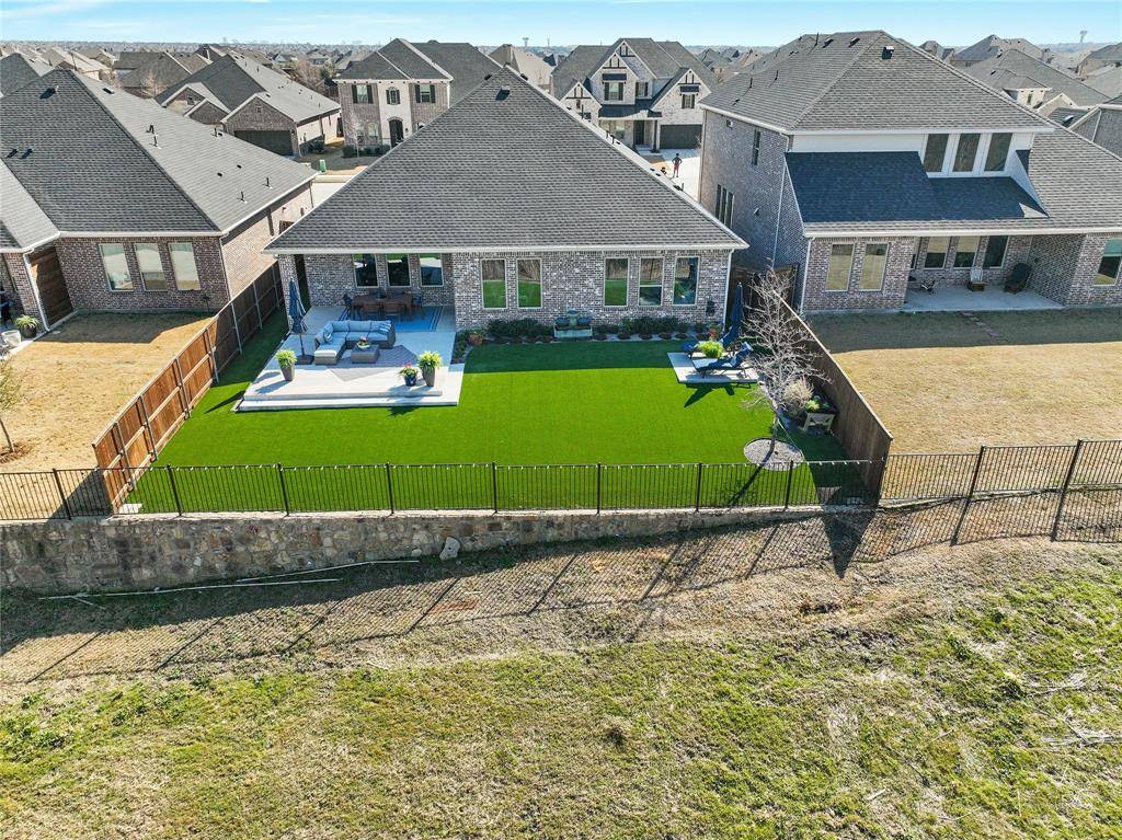 Gorgeous one-story sits on a rare premium lot backing up to the nature preserve in the highly sought-after community of Valencia on the Lake. Less than 2 years old, this home shows like new & boasts over $85K in recent designer upgrades, including new flooring throughout (no carpet) & a no-maintenance artificial-turf backyard with a 400sqft extended patio. The 4 bedrooms, 3 full baths, and an office are perfect for a family or empty-nesters. The open-concept floor plan features: a large family room with fireplace & beautiful, custom-built floating shelves, a dining area & gourmet kitchen with gas cooktop, a large island & ample storage, & a private primary bedroom retreat - all with spectacular views of the nature preserve. The home offers a 2nd private ensuite bedroom perfect for multi-generational living. The remaining 2 bedrooms share a full bath. The office is located at the front of the home for privacy & has a wall of custom built-ins. This home sits on a Split ISD lot – buyers have their choice of school districts. FAR LESS THAN A NEW BUILD - MOVE-IN READY WITH WINDOW TREATMENTS, UPGRADED FLOORING, $20K LOT PREMIUM, & MUCH, MUCH MORE! THIS IS A MUST SEE! Book your showing today!