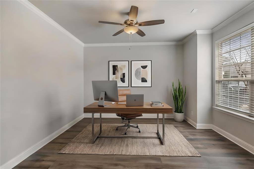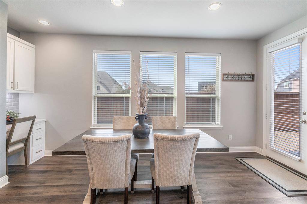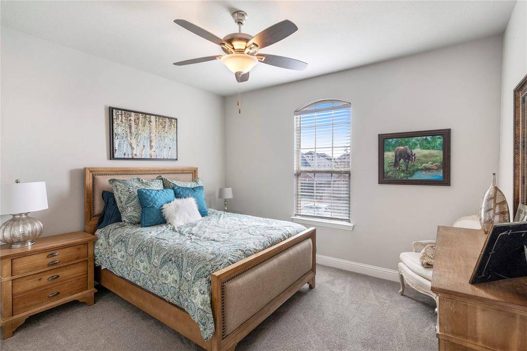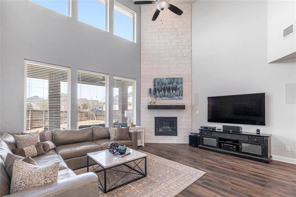 Located in the highly desirable Canyon Falls community and zoned for acclaimed Argyle ISD, this beautifully designed 4-bedroom, 3.5-bath home offers refined living in one of the area's most sought-after master-planned neighborhoods. Situated on a spacious corner lot with generous yard space, this home welcomes you with soaring 20-foot ceilings in the main living area, abundant natural light, and a dramatic floor-to-ceiling stone-look fireplace with gas logs. Luxury Vinyl Plank flooring flows throughout the main living areas, complemented by modern recessed lighting and a seamless open-concept design ideal for both everyday living and entertaining. The kitchen showcases a sophisticated modern aesthetic with two-tone cabinetry, crisp white upper cabinets, expansive quartz countertops, and a sleek subway tile backsplash. A large island with storage and breakfast bar anchors the space, along with an eat-in dining area featuring a built-in desk. Stainless steel appliances include a built-in gas oven and microwave, 5-burner gas cooktop with a vent hood. The dedicated office provides a private work-from-home retreat, while the upstairs game room offers additional flexible living space perfect for relaxing or hosting guests. The spacious primary suite features elegant tray ceilings, abundant natural light, and a thoughtfully designed ensuite bath with a garden soaking tub, oversized walk-in shower with tile surround and bench, and an expansive dual-sink vanity offering generous storage and counter space. All secondary bedrooms are located upstairs in a split floorplan layout, providing privacy and versatility. Residents of Canyon Falls enjoy resort-style amenities including multiple pools, scenic walking and biking trails, parks, a fitness center, and year-round community events—offering an elevated lifestyle in a premier location.