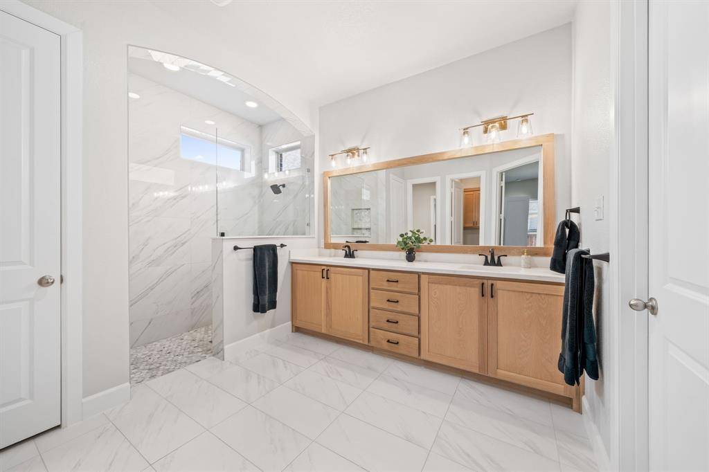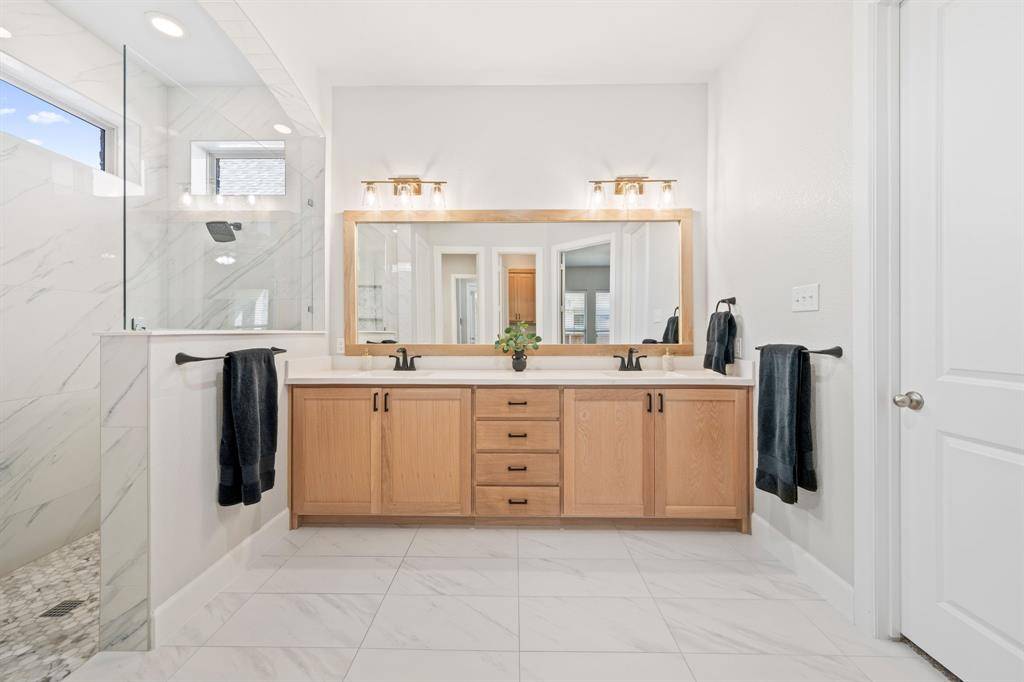 The primary suite is tucked privately on the main level & feels like a retreat of its own. The bathroom has been fully remodeled with warm natural wood tones & striking black fixtures, creating a calm, modern feel. Even the oversized laundry room was thoughtfully placed with direct access to the primary suite to make everyday living just a little easier.