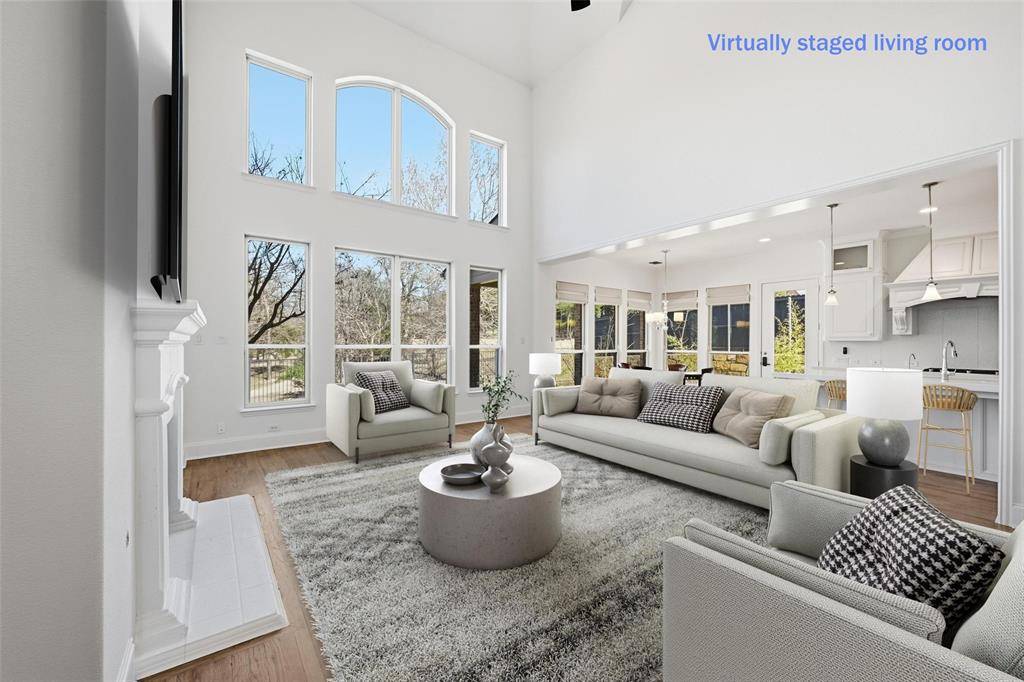 Walls of windows frame lush greenbelt views and mature trees, flooding the interior with natural light and a sense of calm. Step outside to the wrap-around covered patio, ideal for morning coffee, weekend gatherings, or simply unwinding to the sounds of nature. A dunk-able basketball hoop adds a fun touch for friendly competition.