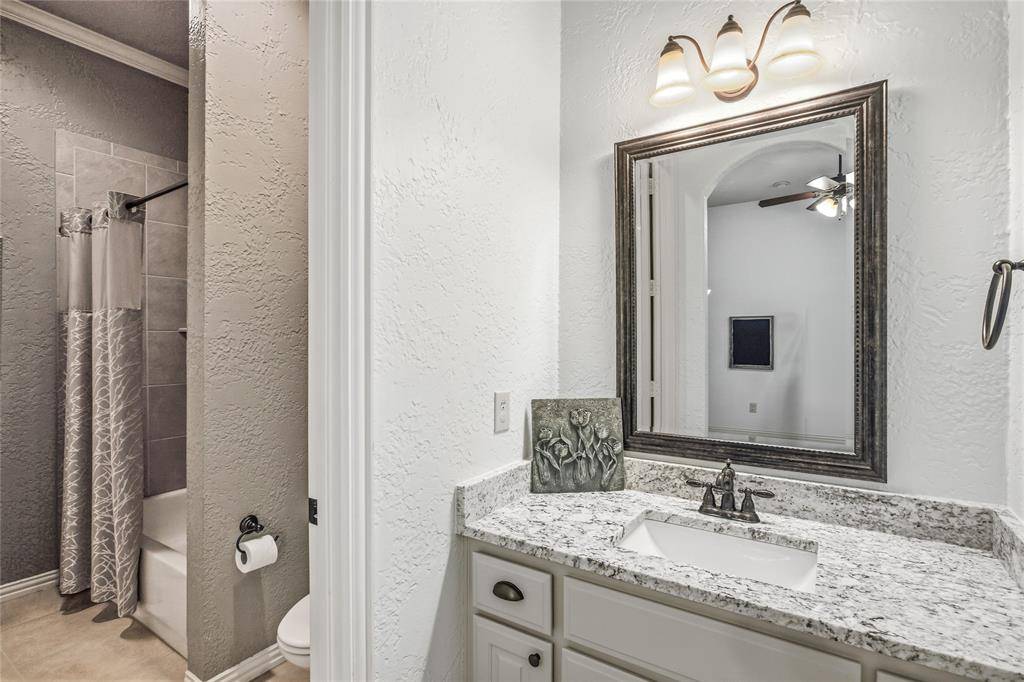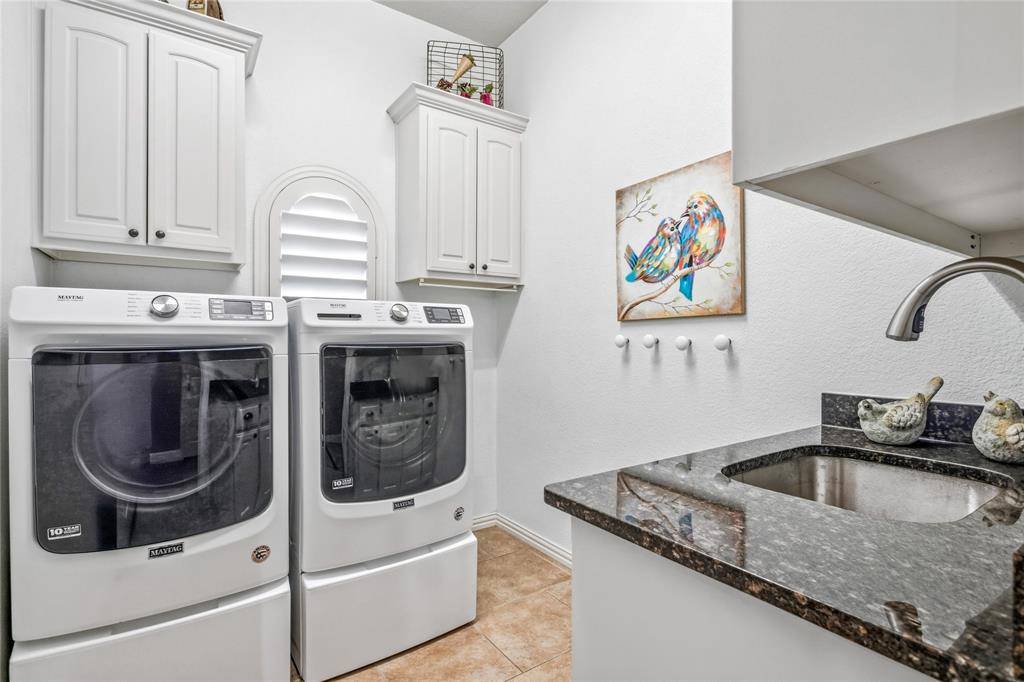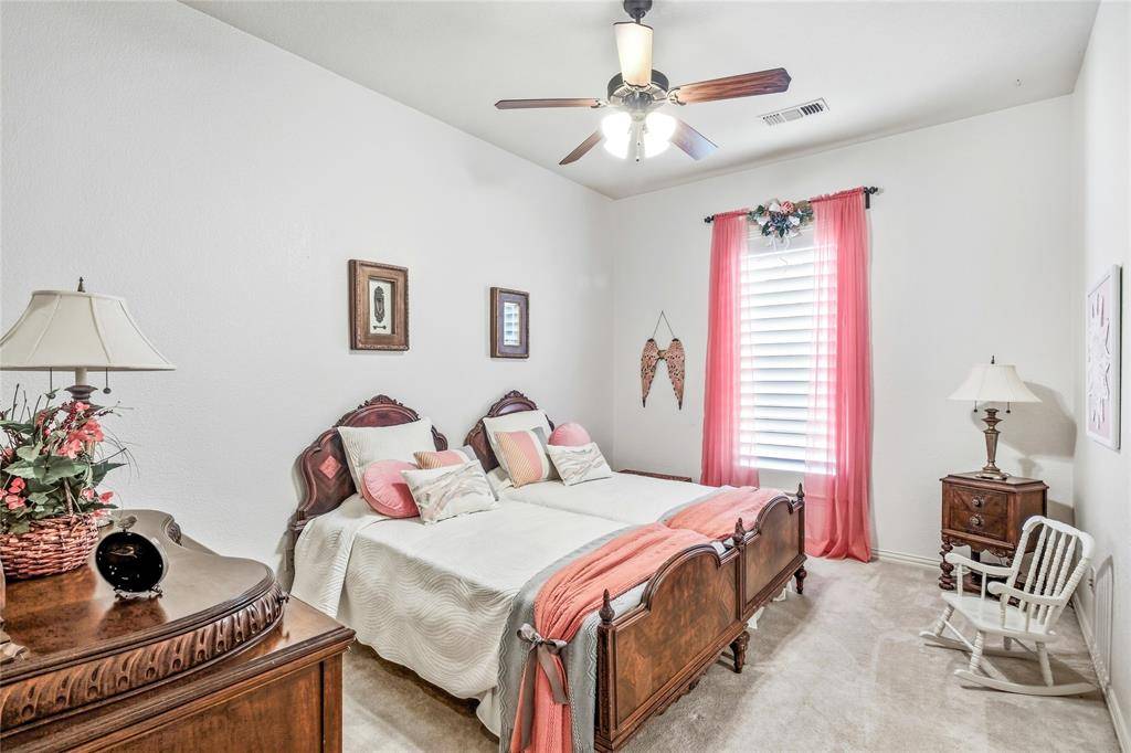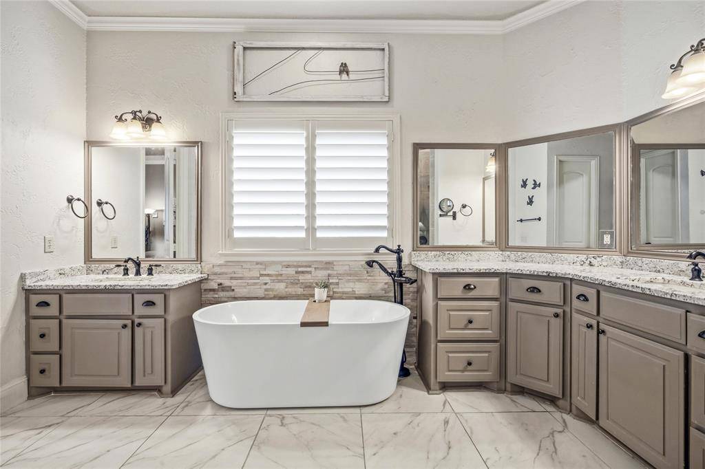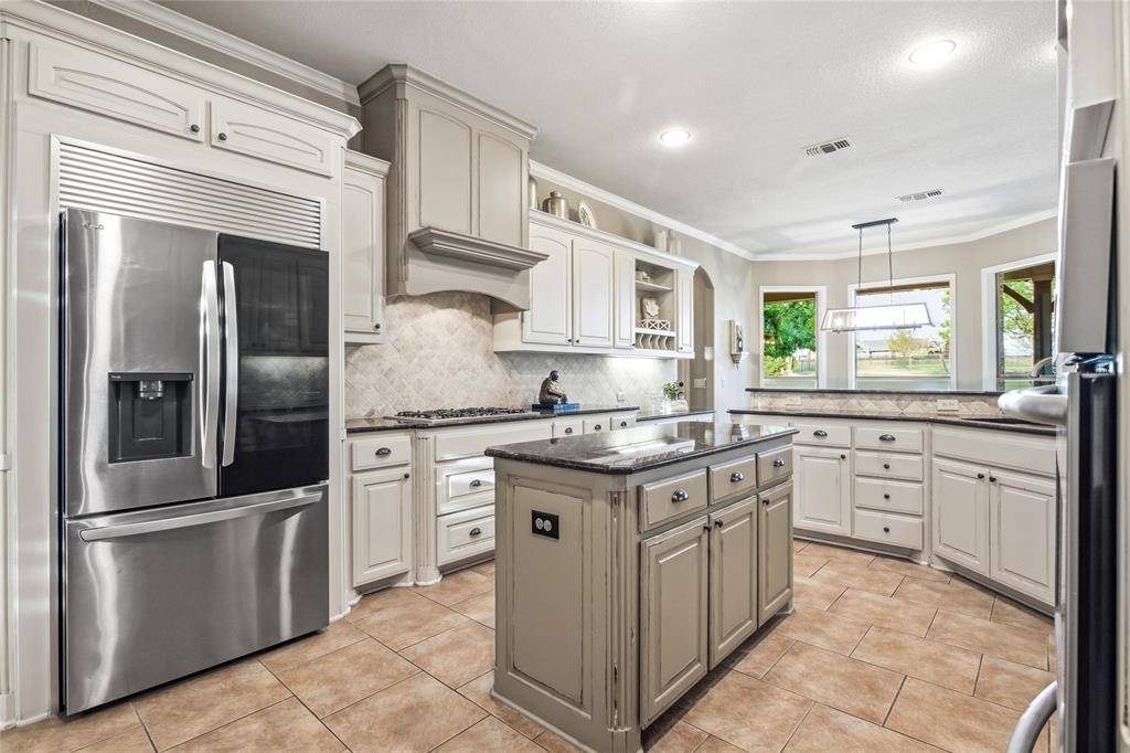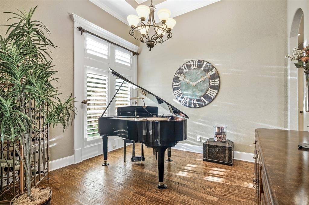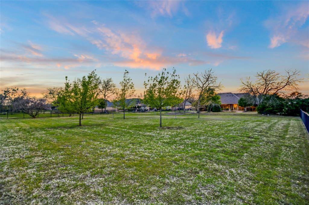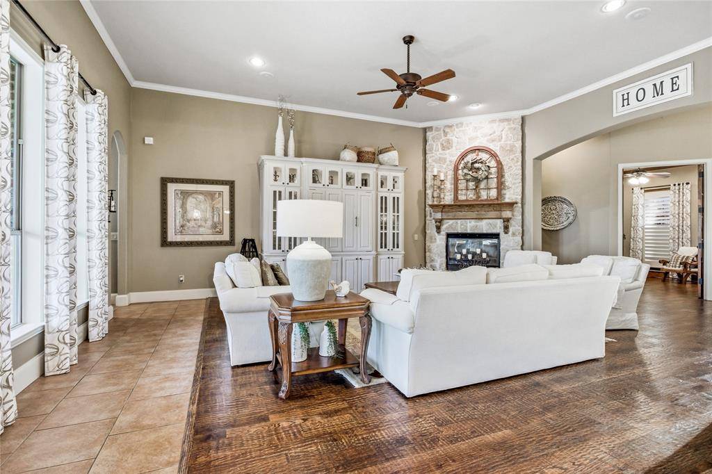 Experience refined country living on a beautifully landscaped one-acre estate in Prosper ISD, custom built by Dave Williams. This stunning single-story home offers timeless craftsmanship, extensive crown molding, exceptional space, and thoughtful design throughout. A beautiful wood front door with glass panels welcomes you into a light-filled entry. Just off the foyer is a private office with custom built-ins, perfect for working from home. Across the entry, a versatile flex space—currently home to a grand piano—can serve as a formal living or dining room. The expansive family room is the heart of the home, featuring a wall of windows overlooking the backyard retreat, a striking stone gas fireplace, and a massive built-in entertainment center with glass display cabinets and lighting. The chef's kitchen is designed for both daily living and entertaining with double ovens, gas cooktop, large island, and a bright breakfast area filled with natural light. A flex room with built-ins sits just off the kitchen, ideal for a playroom, study space, or second living area. A large gym addition completed in 2025 adds even more versatility. The private primary suite is tucked into the back corner of the home and includes a spacious sitting area. The primary bath offers dual vanities, a standalone soaking tub, and a walk-in closet with built-in dresser. Two secondary bedrooms share a Jack-and-Jill bath and feature walk-in closets with built-ins, while a fourth bedroom and full bath are privately located for guests. Enjoy outdoor living with a covered patio, outdoor TV, built-in grill, volleyball net, and a sparkling pool and spa. The acre lot is enclosed with a wrought iron fence. Additional highlights include a 3-car garage with built-in storage, laundry room with sink and cabinetry, HVAC replaced in 2024, and a riding lawn mower that conveys.