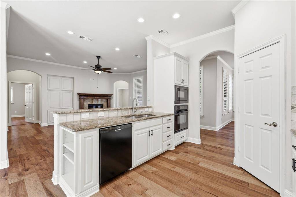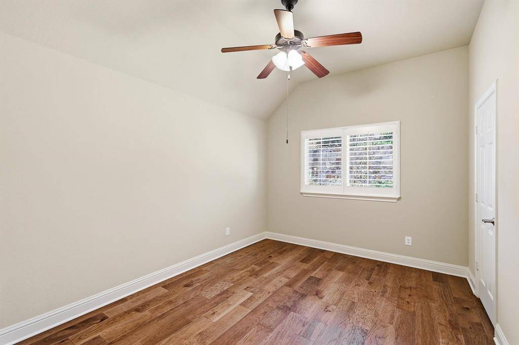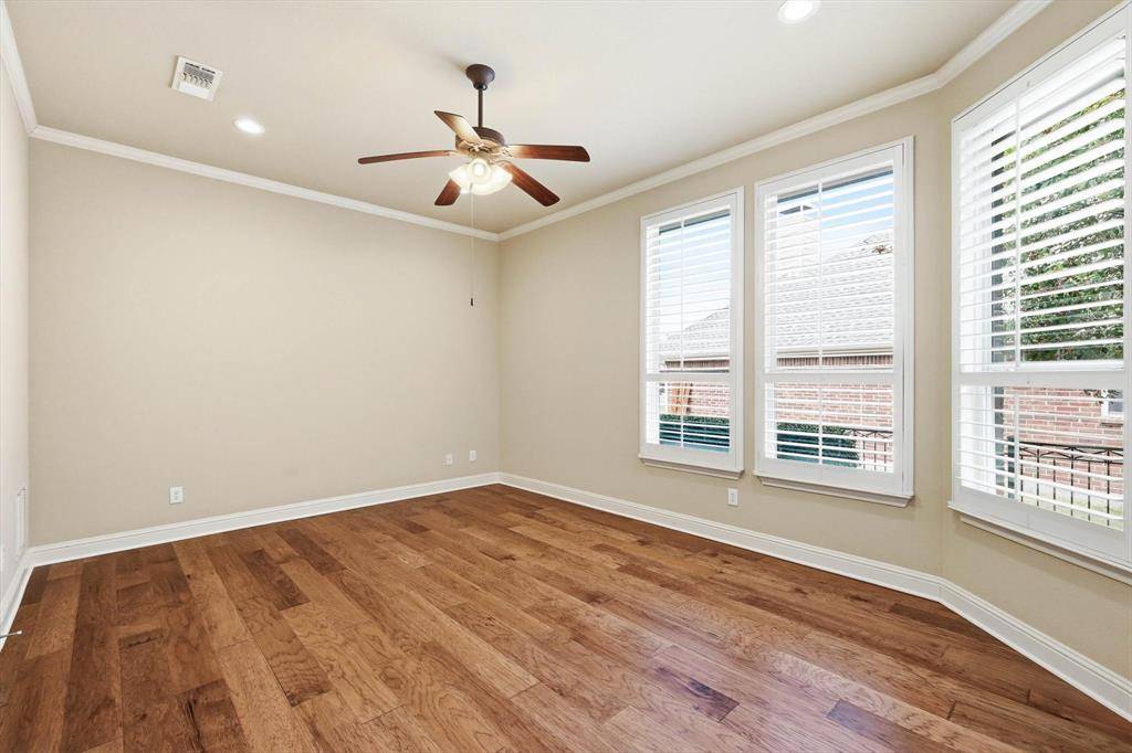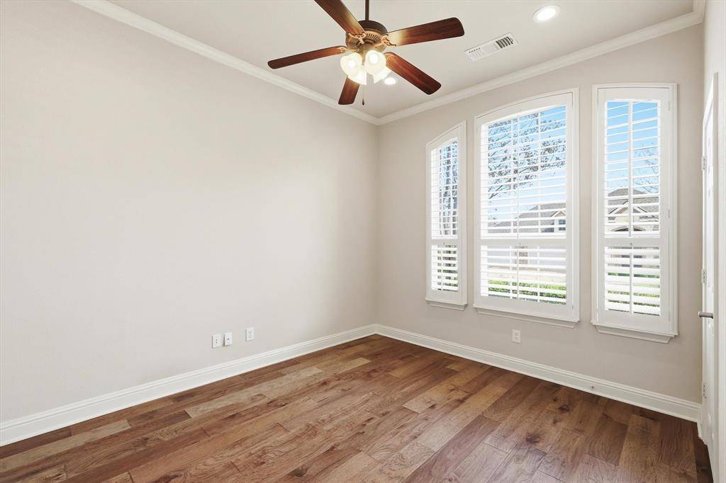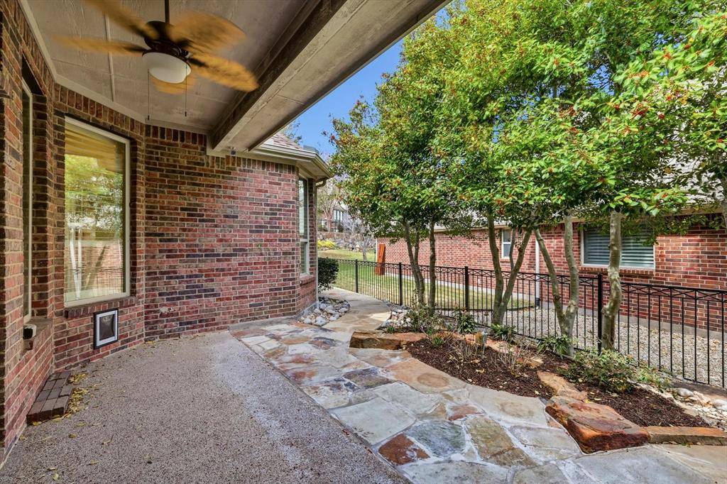 Welcome home to this beautifully maintained home on a cul de sac street in the guarded and gated active adult community of Heritage Ranch. This thoughtfully designed floor plan offers privacy and flexibility with the spacious primary suite tucked in the back of the home overlooking the shaded landscaped patio. A secondary bedroom is positioned on the opposite side with an adjacent full bath, while the front 13x13 room can serve as a third bedroom, home office, den, hobby room, or flex space. Upgrades include warm engineered hardwood floors throughout the living areas and bedrooms, ceramic tile in the bathrooms, granite countertops in the kitchen, updated light fixtures and plantation shutters throughout. The kitchen features white cabinetry, granite counters, Bosch dishwasher and upper and under cabinet lighting. Just off the living room you'll find the quaint, covered patio, with stone pavers and perfectly landscaped and ready to enjoy! Follow the pathway to the massive back yard offering plenty of green space and privacy. Additional upgrades include gutter protectors and cabinet storage system in garage that will convey along with all shelving. Heritage Ranch is a premier, master planned, golf course community with resort style amenities including an 18 hole championship golf course, pickleball, tennis, fitness center, disc golf, indoor pool, outdoor pool, catch and release pond, and a robust activities calendar year round. Conveniently located near major hospitals, shopping, dining, Lake Lavon, and the future McKinney airport. Age restricted community requires at least one occupant to be 50+ and additional occupants to be 19 or older. Make sure to view our virtual tours!