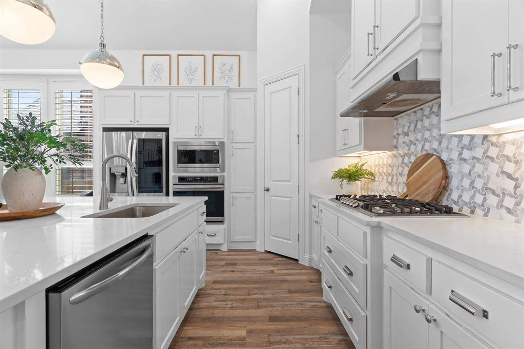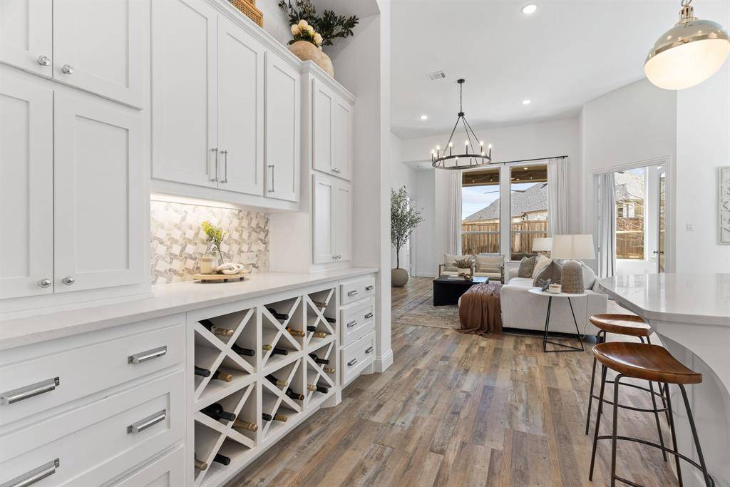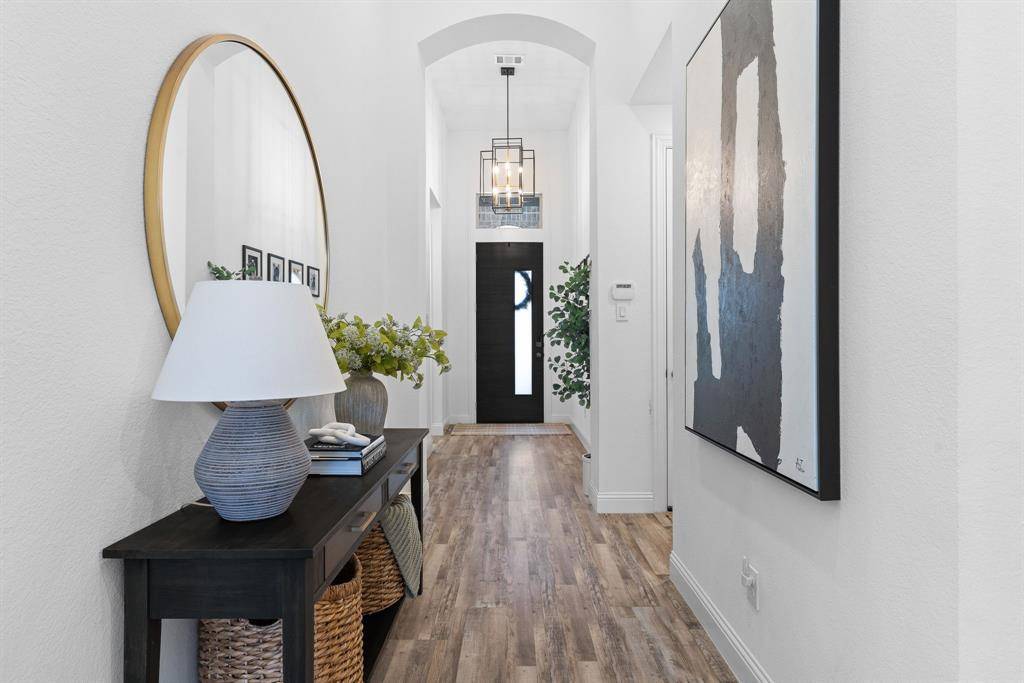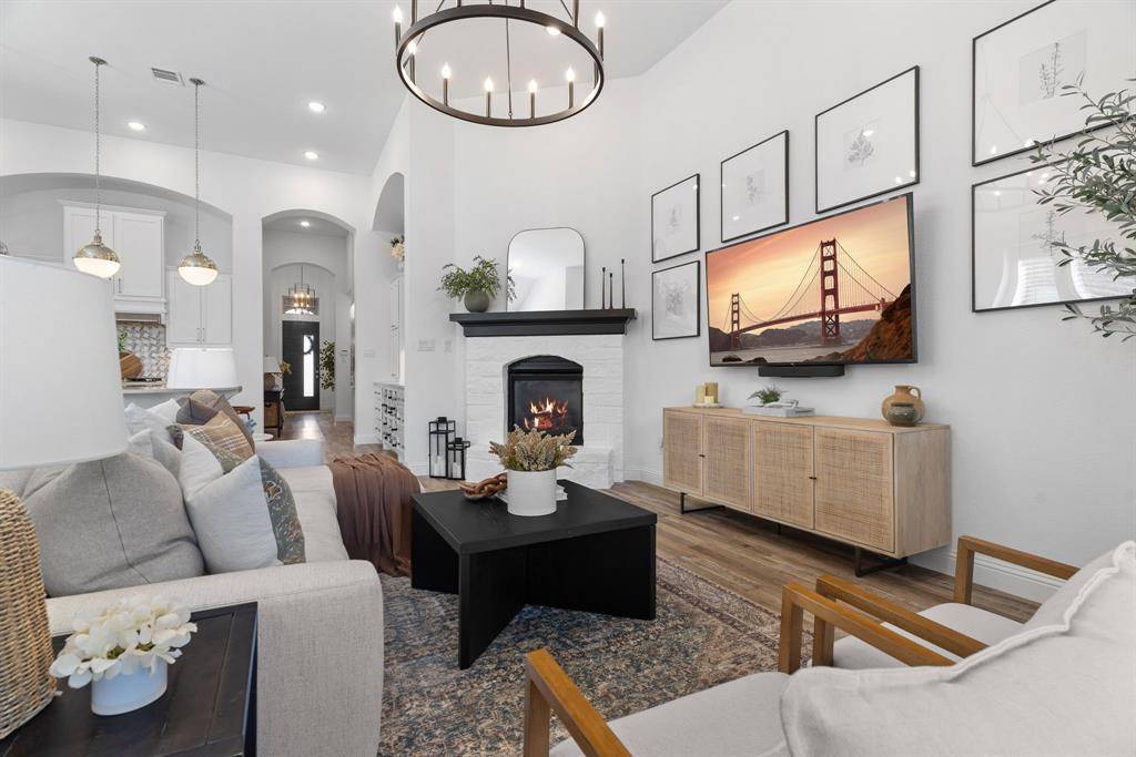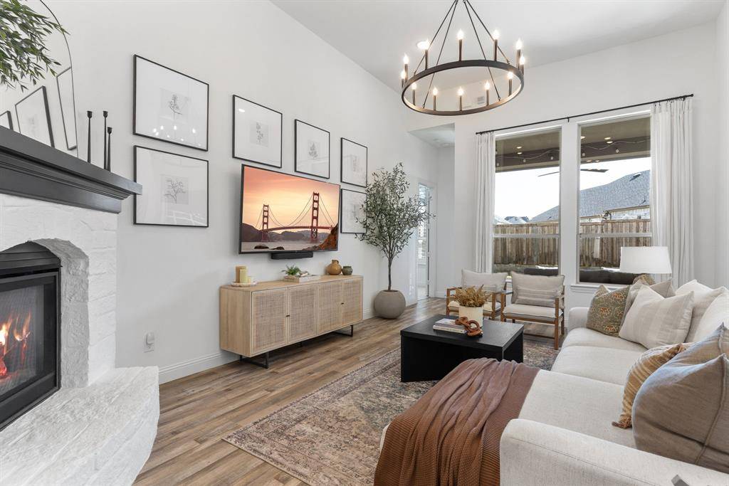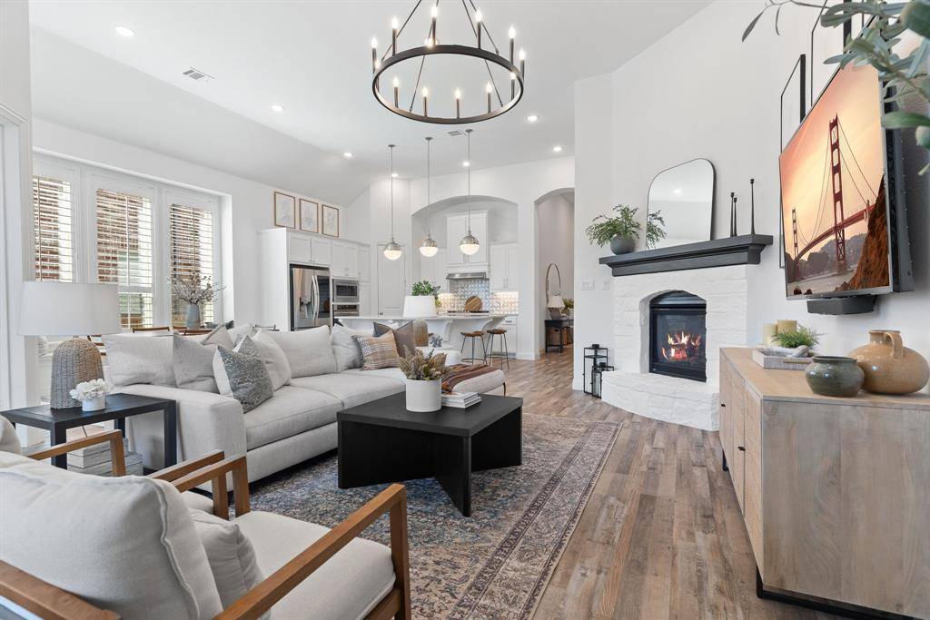 Step into effortless luxury in this stunning one-story Highland Home, perfectly situated in the highly sought-after Star Trail community in Prosper. Move-in ready and thoughtfully designed, this 3-bedroom, 2.5-bath home with a private study and media room offers the ideal blend of comfort, style, and functionality. From the moment you enter, you'll be captivated by the upscale finishes, including luxury vinyl plank flooring that flows seamlessly through the foyer, living, dining, and kitchen areas, complemented by elegant 8-foot doors, designer lighting, and classic plantation shutters. The open-concept floorplan is tailor-made for both everyday living and entertaining. A spacious family room with an eye-catching angled fireplace anchors the home, while the gourmet kitchen impresses with a large center island, quartz countertops, stainless steel appliances, and a 5-burner gas cooktop. A built-in buffet with wine rack adds both charm and convenience for hosting gatherings.