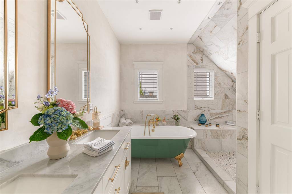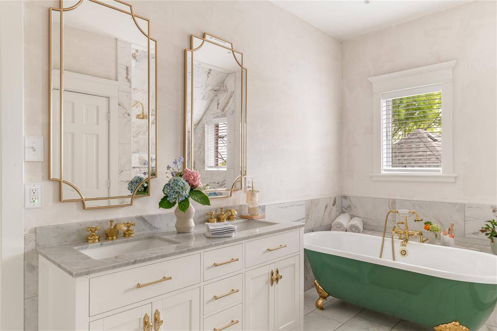 Soaring 10-foot ceilings, solid hardwood floors throughout, and a classic pier and beam foundation set the tone from the moment you enter. The chic kitchen features quartz countertops, high-end appliances, a new electric oven (2025), two walk-in pantries, and a Reverse Osmosis Ultimate Series water system. The new primary suite stuns with marble flooring, a cast-iron soaking tub, and scenic oak canopy views and has TWO large Walk-in closets. Every bathroom has been fully renovated, marble in the primary and second floor west bath, porcelain in the second floor east bath, with cast-iron tubs throughout.