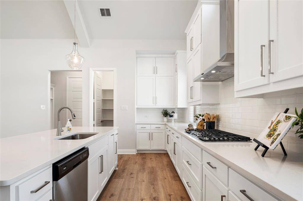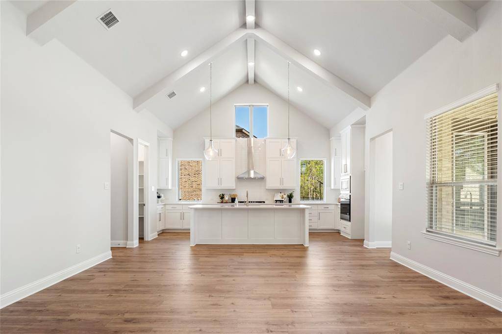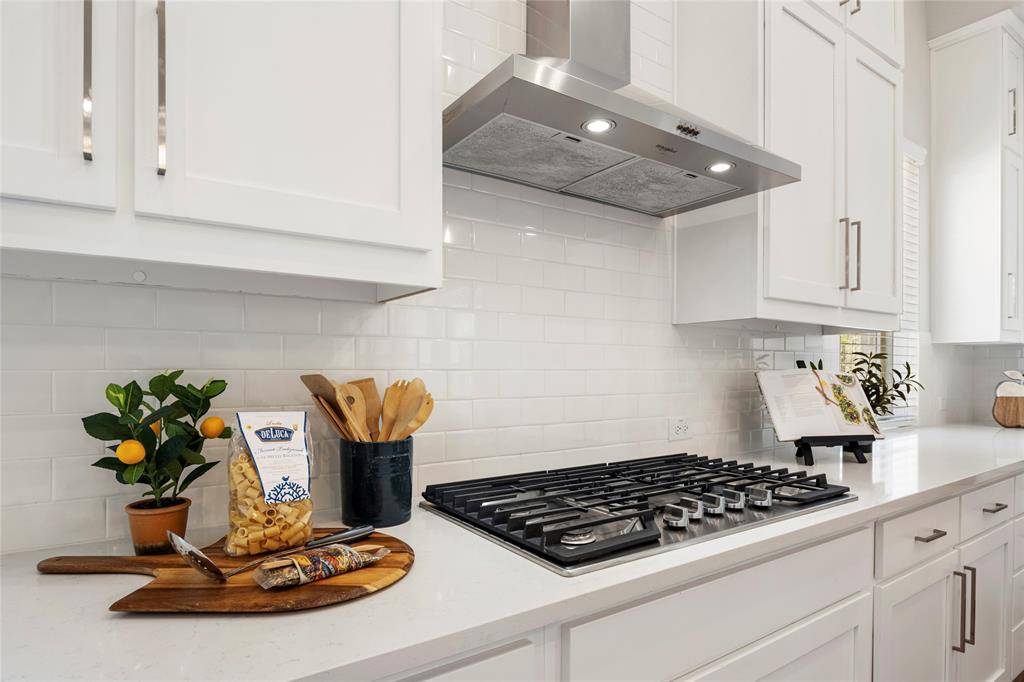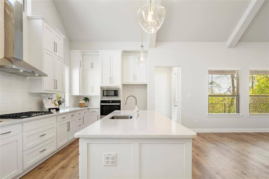 A grand cathedral ceiling elevates the living room, where expansive patio windows invite in abundant natural light and frame serene outdoor views. A charming creek, surrounded by native vegetation, meanders through the property and provides a tranquil backdrop to enjoy from both the living area and the back patio. The adjoining kitchen is equally impressive, featuring quartz countertops, a gas cooktop with vented hood, a large island, glass pendant lighting, built-in appliances, and extensive cabinetry for storage.
