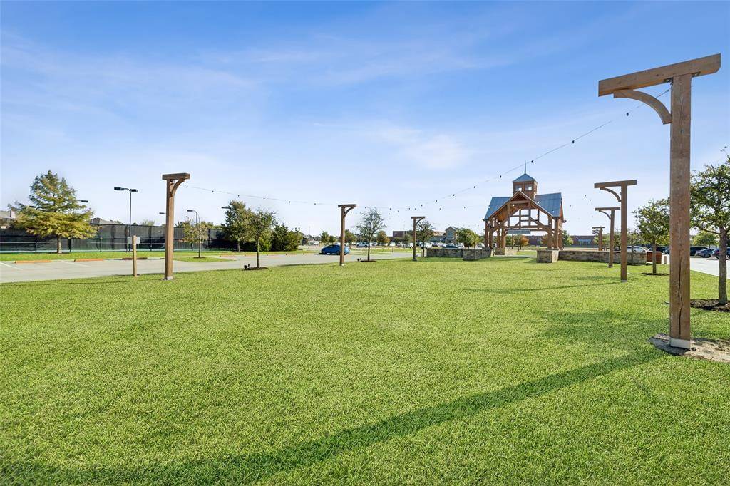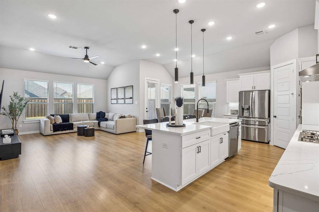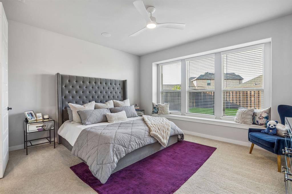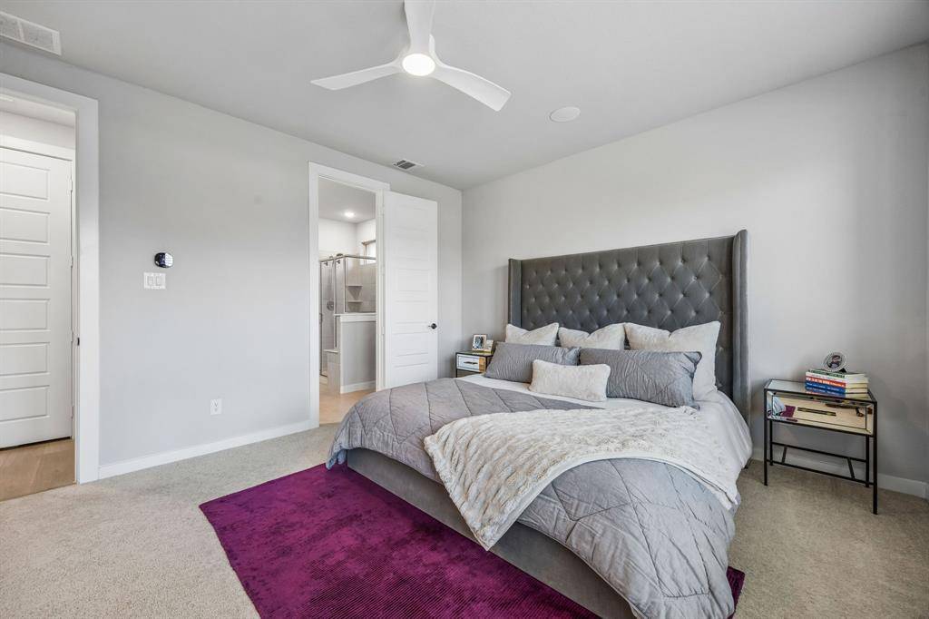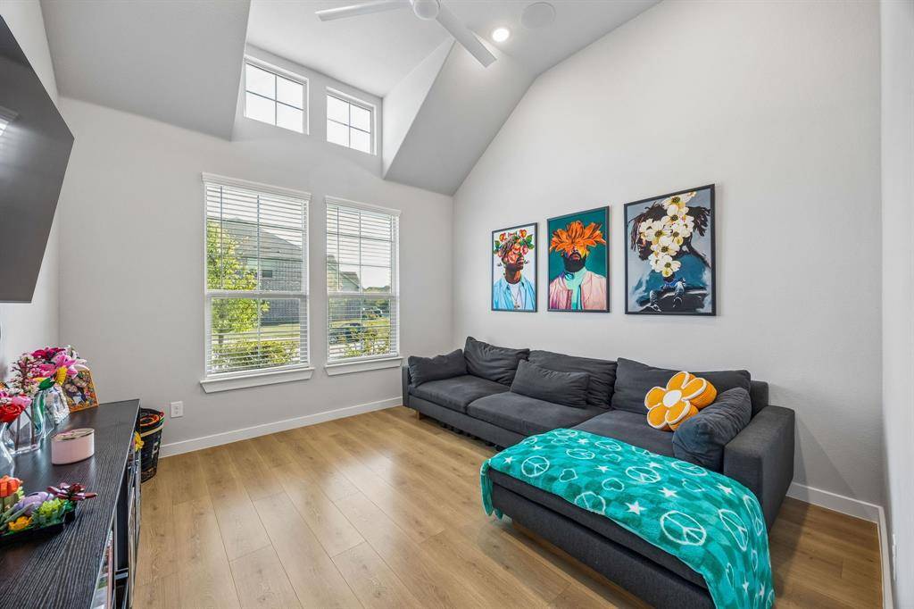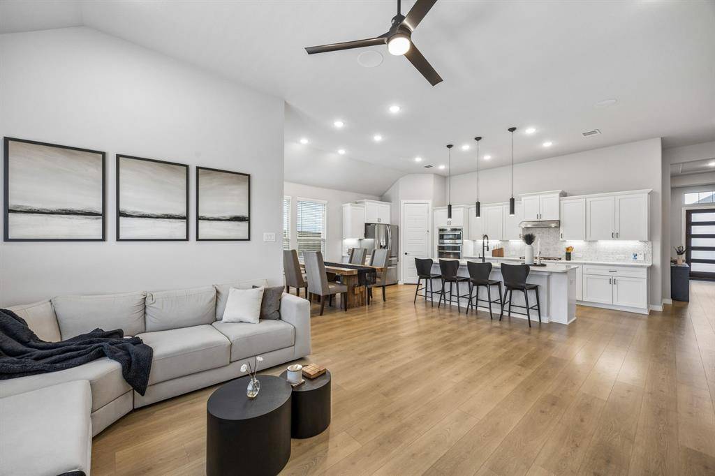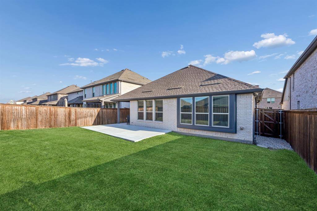 Set within one of the most sought-after master planned communities in the area, this home carries a quiet confidence you notice right away, crisp, polished, and maintained with a level of care you can feel. Light moves effortlessly through the space, giving it a clean, airy feel that still feels warm and grounded. The kitchen and living area open naturally to one another, creating a layout that feels both connected and easy to live in, with finishes that are current and cohesive. Three bedrooms, three full baths, and a true separate living suite that's hard to find, complete with its own living area, private bedroom, and full bath, giving guests or extended family a space that feels completely their own. One of the secondary bedrooms has been thoughtfully reimagined as an office with a custom built-in desk, while walk-in closets and consistent, neutral finishes keep everything feeling elevated and pulled together. Windows line the back of the home, bringing in soft natural light and enhancing the sense of space, with an extended concrete patio that creates a seamless transition outdoors. The home is wired for sound with speakers in most rooms and includes a whole home water filtration system, adding comfort and convenience in the details. Set within Light Farms, a resort-style community that truly feels different from the rest, just two blocks from one of the community pools, with access to pickleball and sport courts, a full gym, sand volleyball, stocked fishing ponds, a dog park, camping, and over 200 events each year that keep the neighborhood active and connected, with front yard maintenance included in the HOA. Golf cart-friendly streets make it easy to head to Frontier Park, grab coffee, or meet friends at the neighborhood restaurant, creating a lifestyle that feels easy, social, and genuinely fun to be part of, all just a short walk to Light Farms Elementary and the amenity center, and zoned to top-rated Prosper ISD.