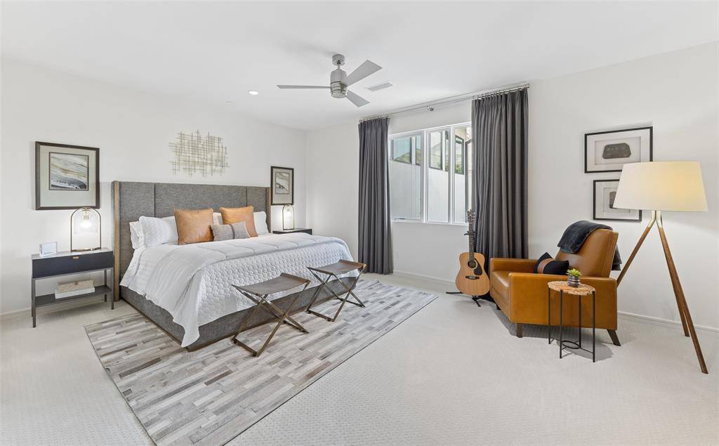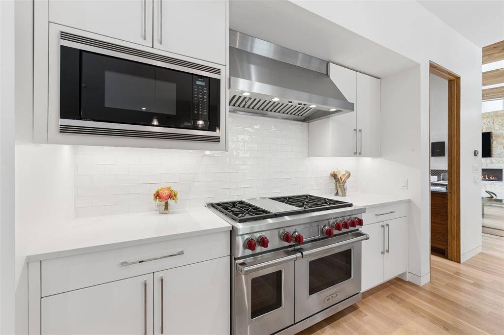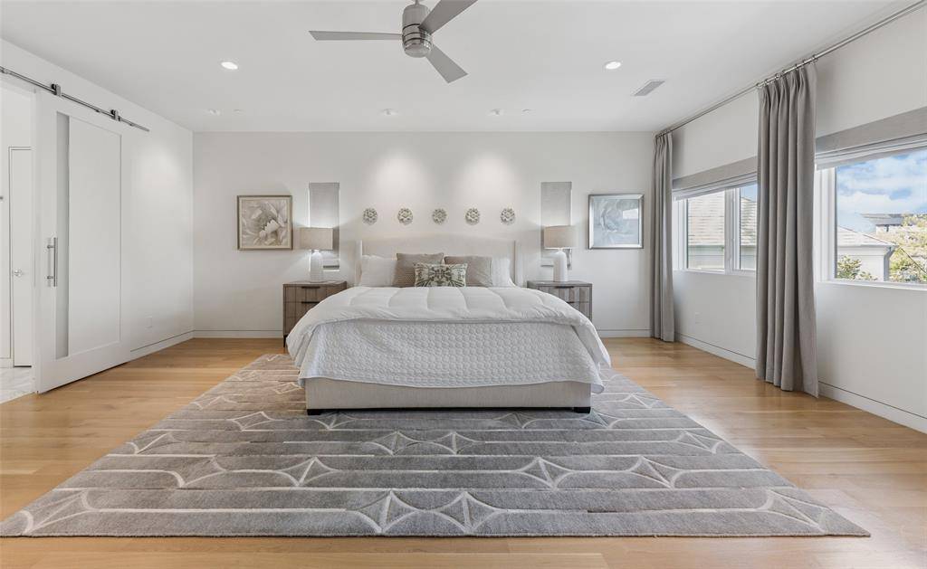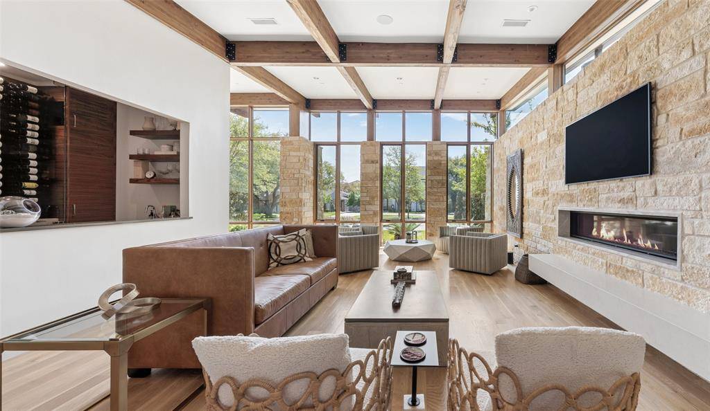 This striking 6,143-square-foot residence blends refined architecture, energy efficiency, and everyday functionality. Sleek lines softened by warm Austin stone create a sophisticated exterior, while expansive windows and sliding glass doors fill the home with natural light and provide a seamless indoor-outdoor connection.