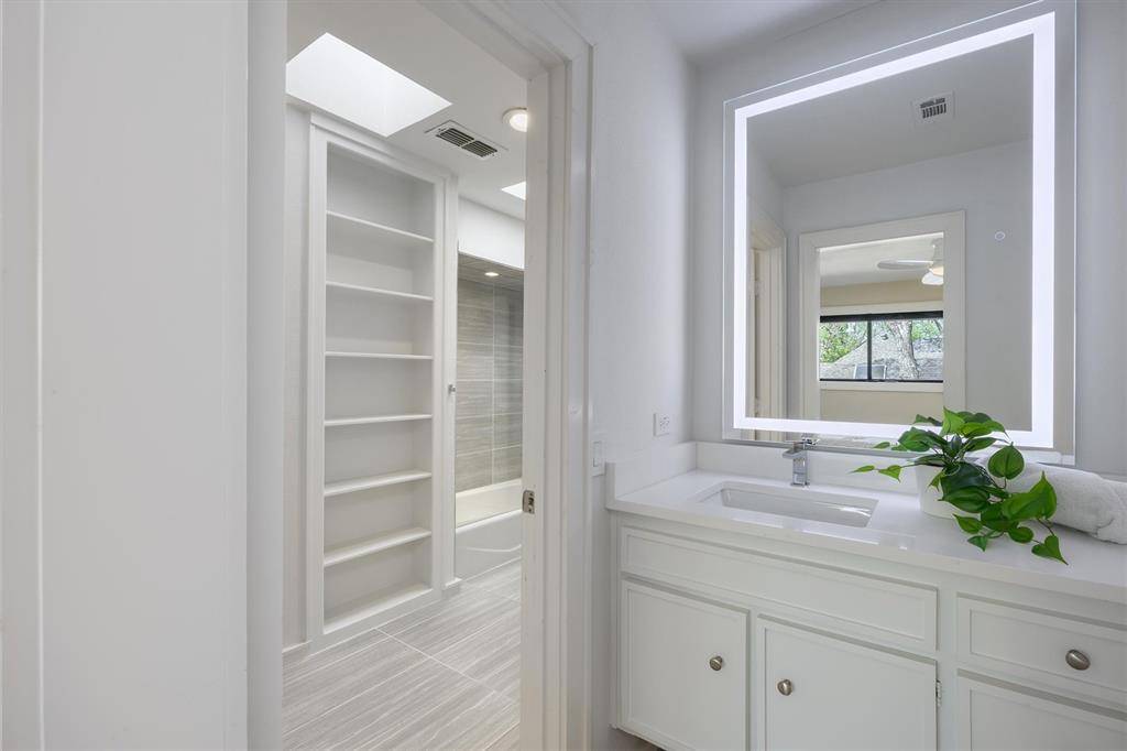 The private primary suite is a true retreat, offering direct access to the pool and a spa-inspired bath with an oversized walk-in shower, soaking tub, and a custom-designed closet built for both beauty and organization.