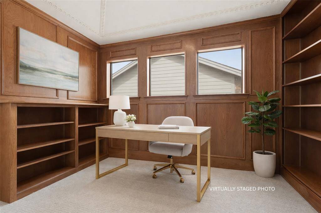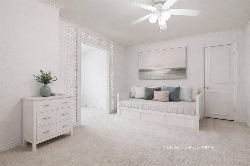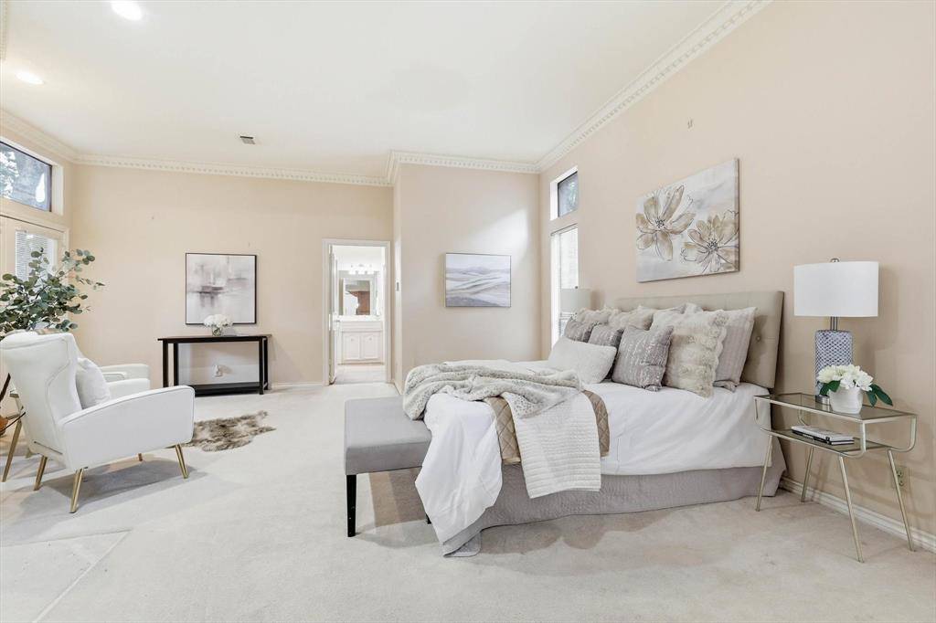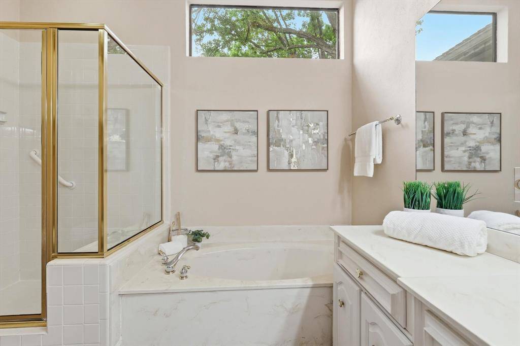 Situated in sought-after Bent Tree Village near Bent Tree Country Club, this inviting home offers comfort, functionality, and a low-maintenance lifestyle in a prime Far North Dallas location with easy access to the Dallas North Tollway, airports, and downtown. A welcoming entry with double doors opens to an expansive living area featuring a fireplace, custom built-ins, and seamless flow to the kitchen, bar, and private backyard—ideal for everyday living and entertaining. The kitchen offers abundant cabinetry, generous counter space, and a sunny breakfast area, with easy access to the formal dining room, utility space, and attached two-car garage. The main-level primary suite overlooks the backyard and features dual vanities, a separate tub and shower, and two walk-in closets. Upstairs, two spacious bedrooms share a bath, along with a versatile flex space perfect for a home office, playroom, or additional living area. Enjoy serene outdoor living with a shaded porch and private courtyard designed as peaceful, zen-inspired spaces—perfect for relaxing or unwinding. Wrought iron fencing and thoughtful updates throughout enhance the home's appeal. Priced to make it your own, this is a wonderful opportunity for lock-and-leave living in one of North Dallas' most established neighborhoods.
