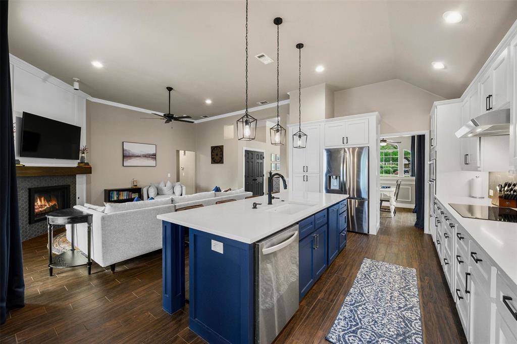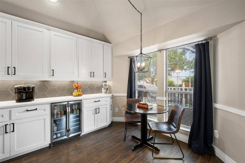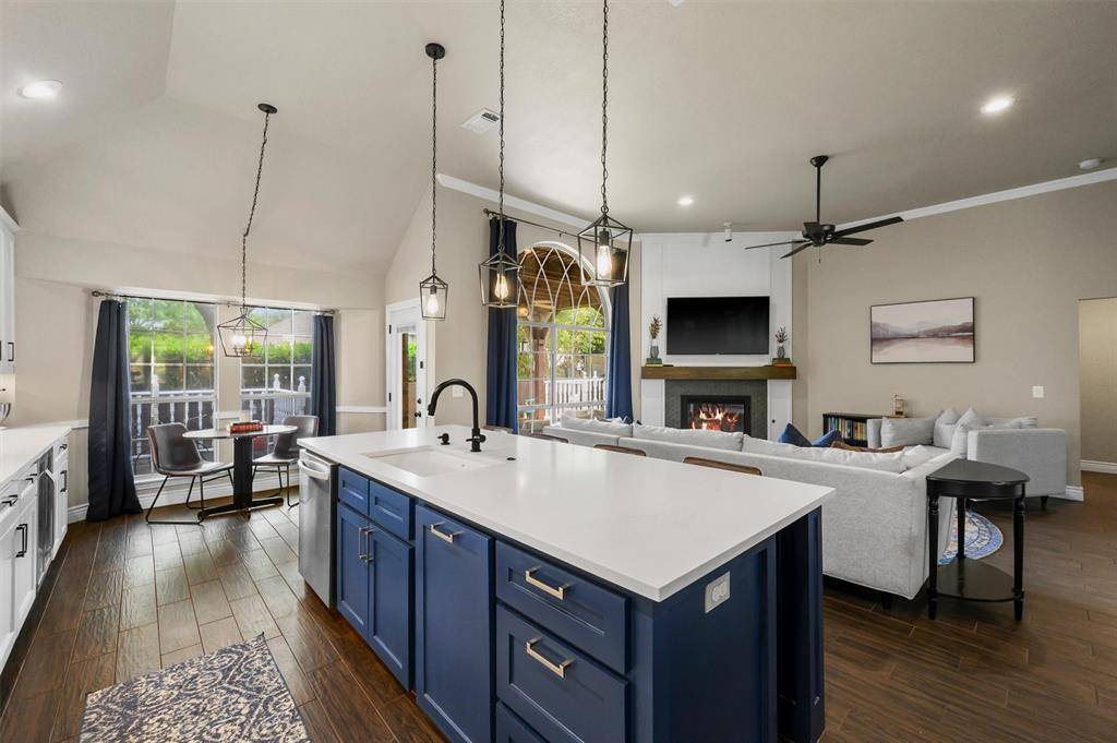 Designed with both comfort and functionality in mind, the open-concept layout seamlessly connects the main living areas, creating a versatile space ideal for everyday living and entertaining. The kitchen is a standout feature, offering abundant cabinetry, generous quartz countertop space, a built in wine fridge and stylish pendant lighting that adds a modern touch while enhancing the home's warm and welcoming feel. Stylishly updated fireplace in the family room featuring gas logs for added warmth and style. No carpet, wood-look ceramic tile flooring runs throughout the bedrooms and main living areas, complemented by upgraded 5-inch baseboards for a clean, custom finish. Both bathrooms have been nicely updated, featuring spacious vanities, ample storage, and tasteful finishes that blend style with everyday practicality. The primary bath is enhanced with upscale upgrades, including a standalone soaking tub and a frameless freshly tiled shower, creating a spa-like retreat.